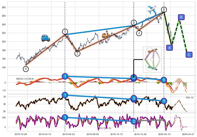 ➢ 1,3,5驱动浪MACD, RSI, KDJ走势都出现【常规背离】反转信号增强