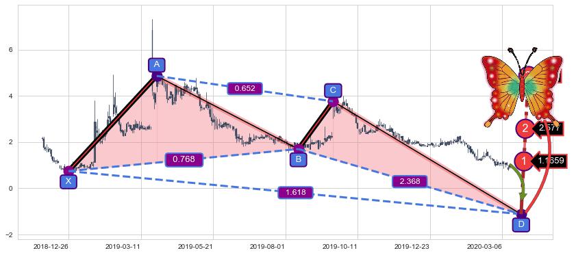 ➣ 未完成【蝴蝶】形态起点X: 2018-12-26, 已到达C点: 2019-09-18, 预测最终D点: 2020-03-25, 共313交易日