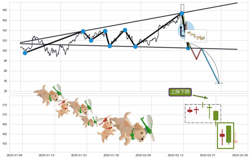 ➢ 高点影线(2020-02-25: 164.24 )→回踩→第二根k线高点(2020-02-24: 162.23 )