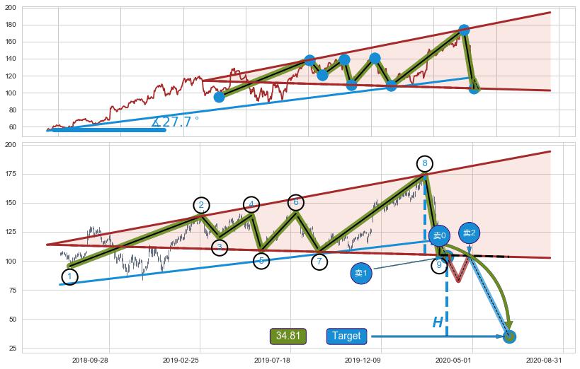➢ 【阻力】高点阻力位【②④⑥⑧】一顶高于一顶,构成扩散三角的上斜边