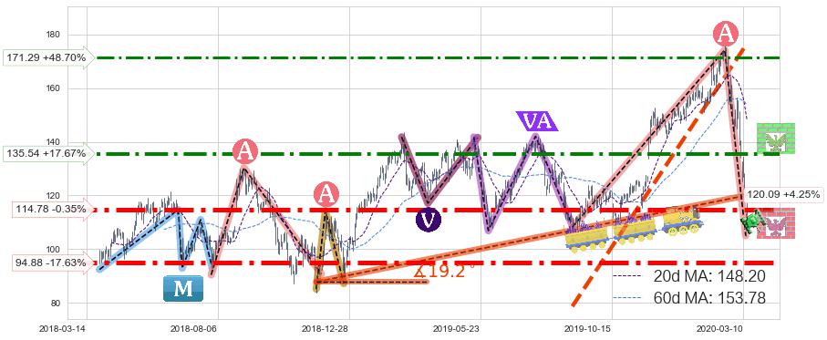 ♘ 阻力价格位171.29,可信任强度56.04%,距离最后交易2020-03-13形成的收盘价格115.19相差 +48.70%