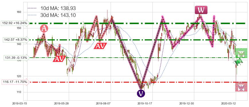 ♘ 阻力价格位152.92,可信任强度93.45%,距离最后交易2020-03-13形成的收盘价格131.56相差 +16.24%