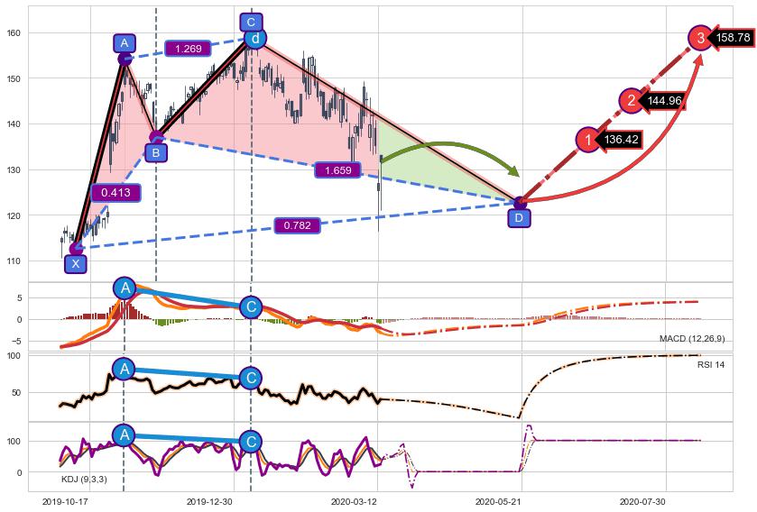 ➣ D点拟合预测价格122.60,距离最后交易收盘价格131.56相差 -6.81%