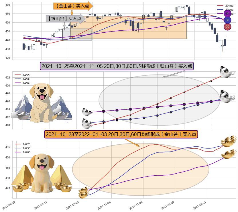 ⚃ 2021-10-29-日至2022-01-03-日显现 20日-30日-60日均线 【金山谷】买入点 其再次确认了买入信号,可靠性更强,买入