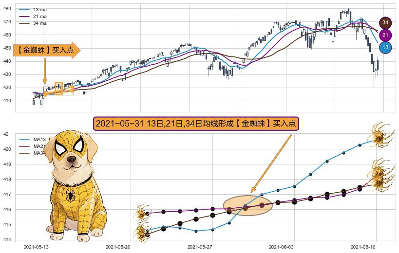 ⚀ 2021-05-31日显现 13日-21日-34日均线 【金蜘蛛】买入点 看多信号,后市看涨,买入