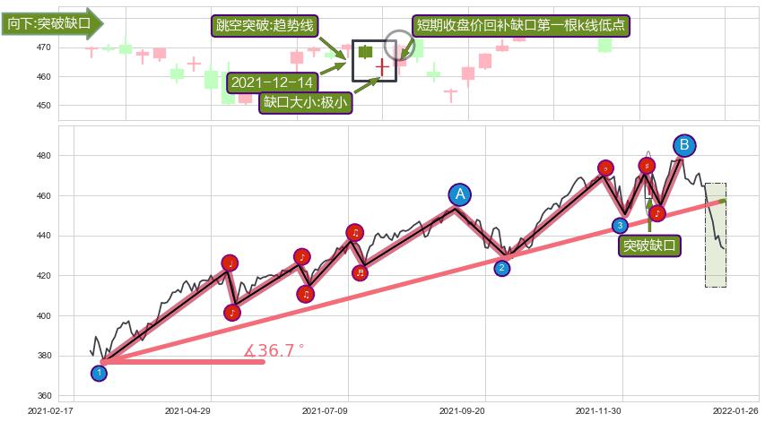 ➢ 收盘价(2021-12-15: 470.60 )→回踩→第一根k线低点(2021-12-13: 466.27 )