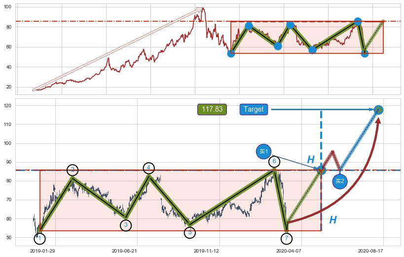➣ 最小中继整理涨幅→𝐇: 32.13 (上平行阻力线与下平行支撑线的垂直距离)