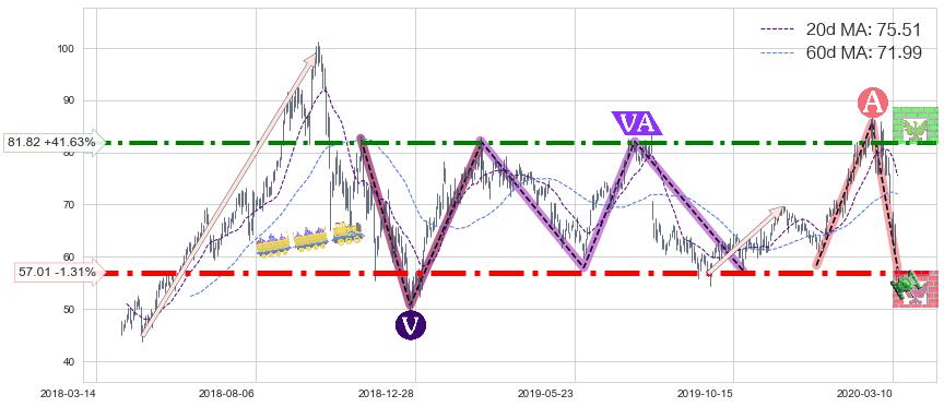 ♘ 支撑价格位57.01,可信任强度86.70%,距离最后交易2020-03-13形成的收盘价格57.77相差 -1.31%