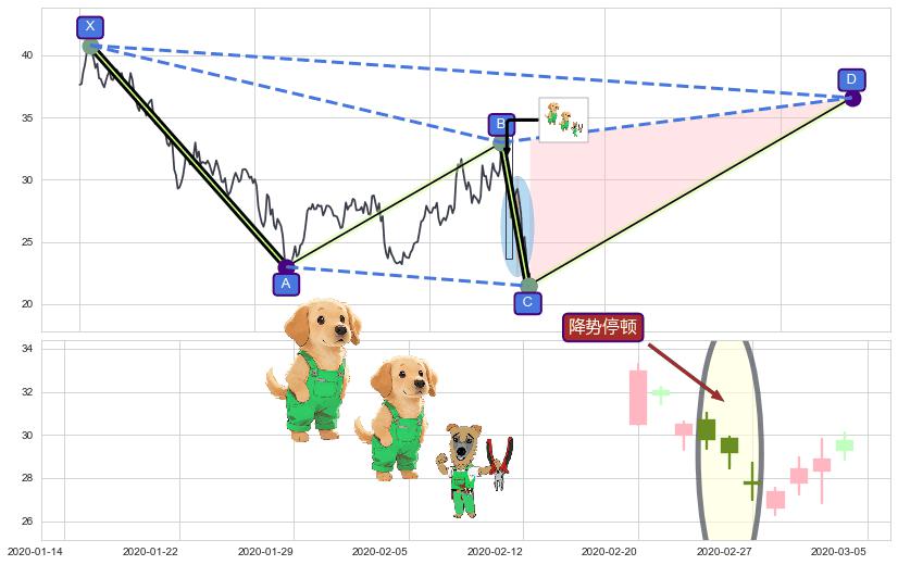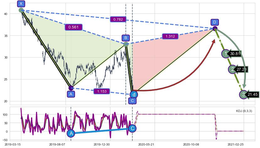 ➣ D点拟合预测价格36.59,距离最后交易收盘价格22.43相差 +63.13%