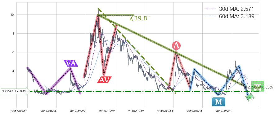 从2018-02-28至2020-01-09,共包含470个交易日,阶段股价上涨6.91%,阶段股价变动位移路程比: 1 : 289,上涨趋势角度: 39.8