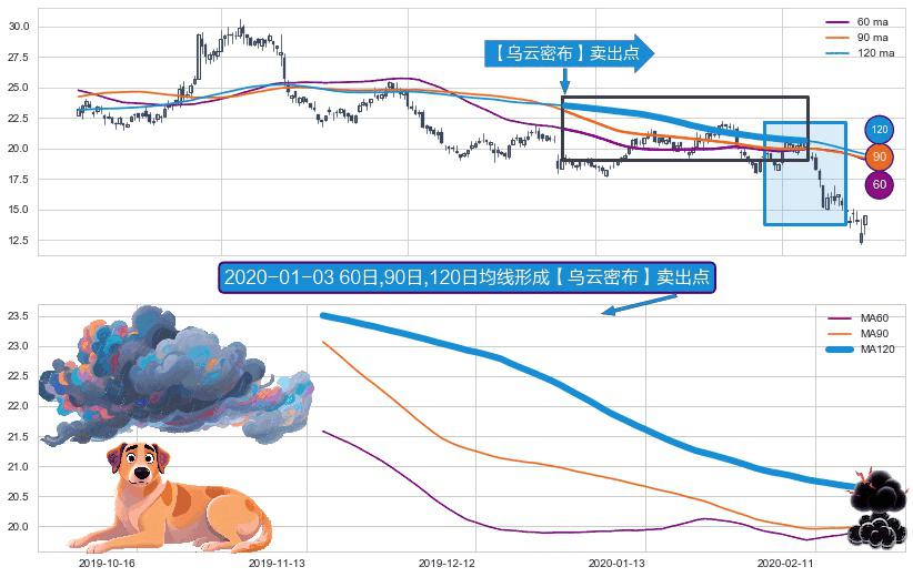 ⚀ 2019-11-15日-2020-02-20日显现 60日-90日-120日均线 【乌云密布】卖出点 看空信号,后市看跌,卖出