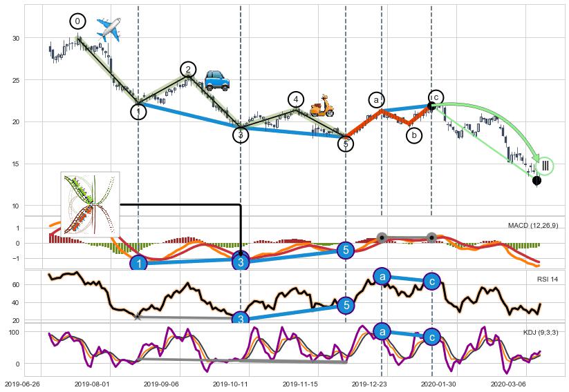 ➣ 第一, 三, 五浪下跌动能逐渐【衰弱变小】,趋势呈现不稳迹象