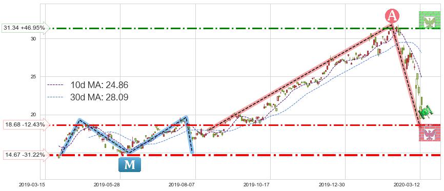 ♘ 支撑价格位18.68,可信任强度59.33%,距离最后交易2020-03-13形成的收盘价格21.33相差 -12.43%