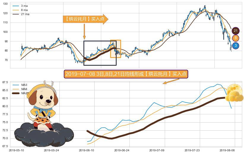 ⚀ 2019-06-06日-2019-08-05日显现 3日-8日-21日均线 【烘云托月】买入点 看多信号,后市看涨,买入