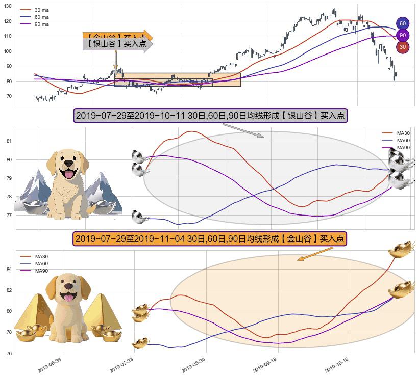 ⚀ 2019-07-30-日至2019-11-04-日显现 30日-60日-90日均线 【金山谷】买入点 其再次确认了买入信号,可靠性更强,买入