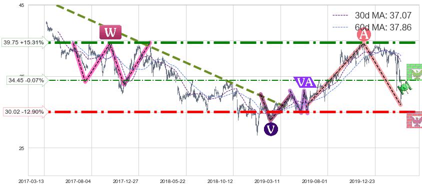 ♘ 支撑价格位30.02,可信任强度94.90%,距离最后交易2020-03-13形成的收盘价格34.47相差 -12.90%