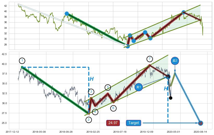 ➢ 【已确认突破】最后价格:34.47与最小【整理】第一目标价格→(2020-08-14: 24.97 )相较: 下跌空间【中等】