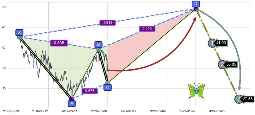 ➣ 未完成【蝴蝶】形态起点X: 2017-03-17, 已到达C点: 2020-03-12, 预测最终D点: 2023-01-26, 共1501交易日