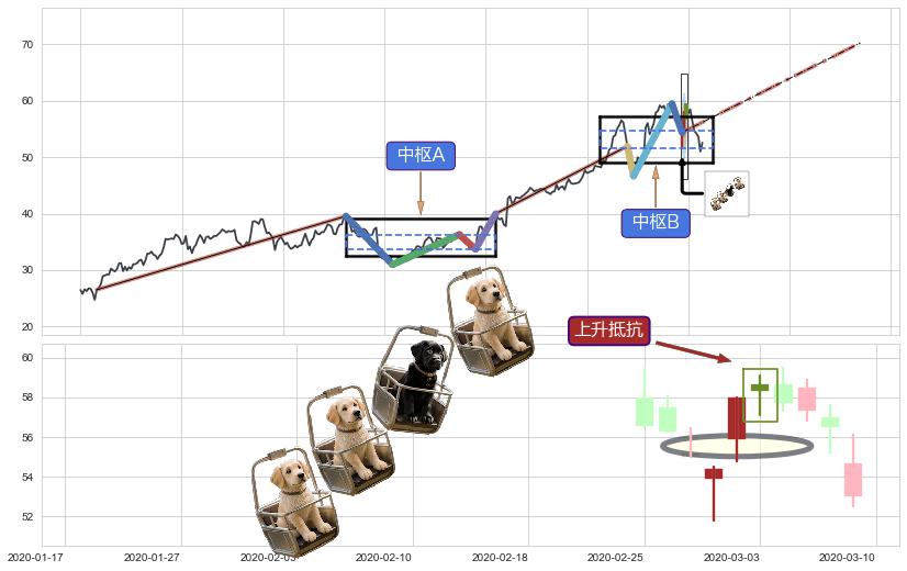 ➣ 【中枢B】:2020-01-21-2020-02-28,中枢由4笔构成,共28交易日, ZG=54.39, ZD=51.95