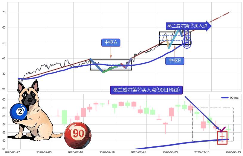 🍖 长线趋势跟踪组合短线均值回复[强支撑信号]2018-10-11-2020-03-11上升趋势依然成立(上涨趋势跟踪依然可行),短线价格略微下行回调(均值回复猜想),即将接近趋势提供的未破位的支撑价格:52.93。