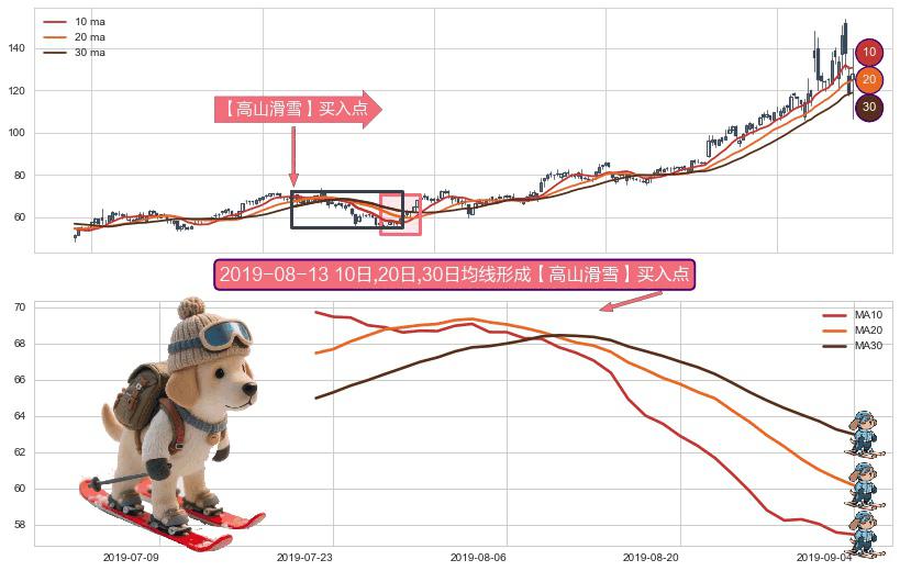 ⚀ 2019-07-22日-2019-09-04日显现 10日-20日-30日均线 【高山滑雪】买入点 看多信号,后市看涨,买入