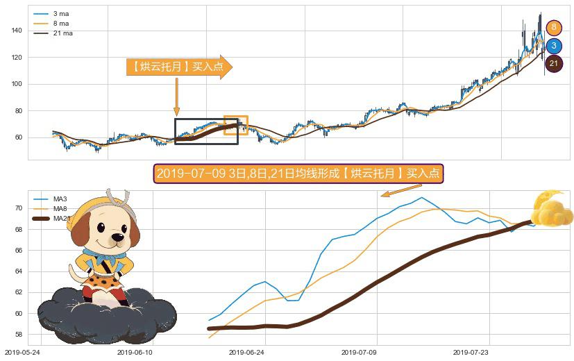 ⚀ 2019-06-17日-2019-07-30日显现 3日-8日-21日均线 【烘云托月】买入点 看多信号,后市看涨,买入
