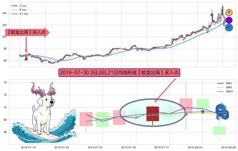 ⚀ 2019-07-30日显现 3日-8日-21日均线 【蛟龙出海】买入点 看多信号,后市看涨,买入