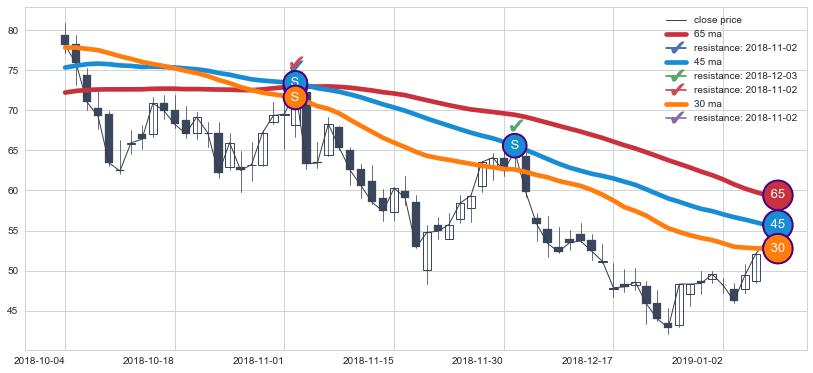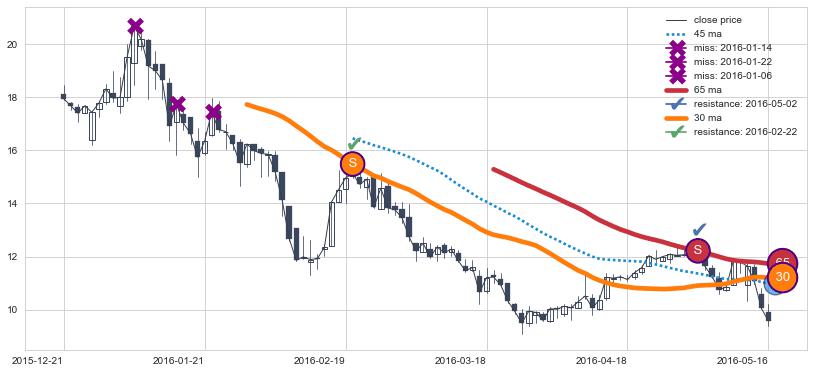 ➢ 最优均线组合共正确确认支撑阻力信号9处,正确确认率 64.29%