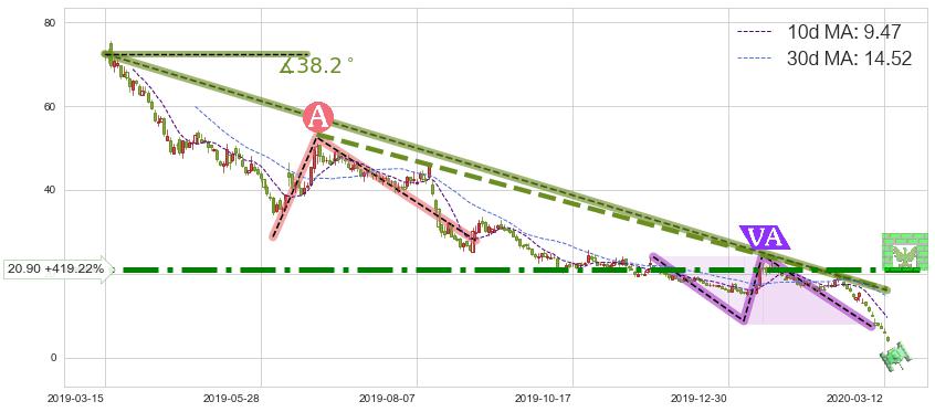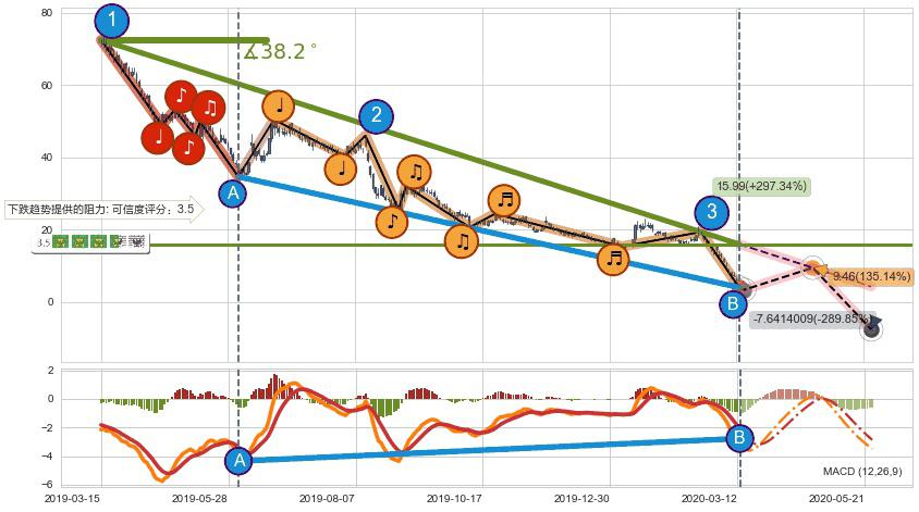 从2019-06-21至2020-03-13,共包含184个交易日,阶段股价下跌-218.73%,阶段股价变动位移路程比: 1 : 3,下跌趋势角度: 38.0