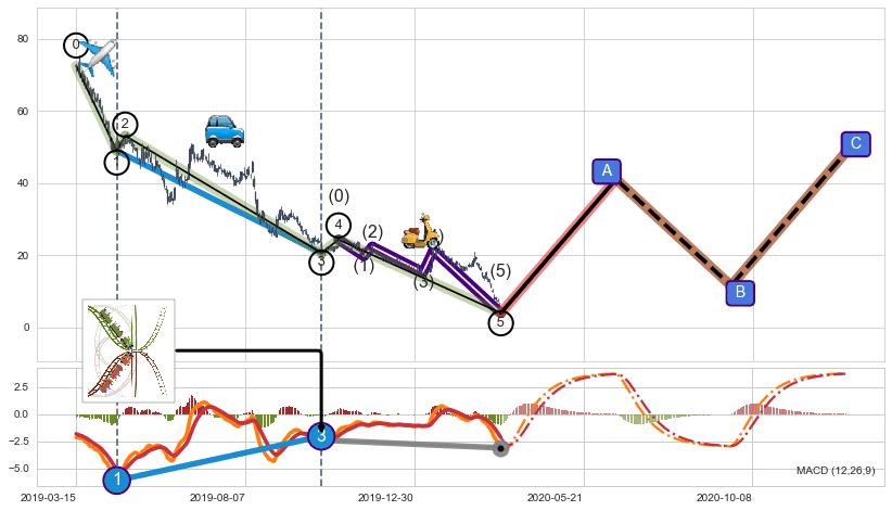 ➣ 第一, 三, 五浪下跌动能逐渐【衰弱变小】,趋势呈现不稳迹象
