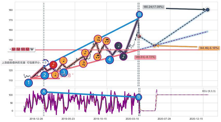 ♘ 在最后的上升阶段2018-11-02至2020-03-13存在 持续未破位的支撑位 ,支撑价格140.51,支撑可信任强度82.55%,其距离最后价格153.94相差 -8.72%