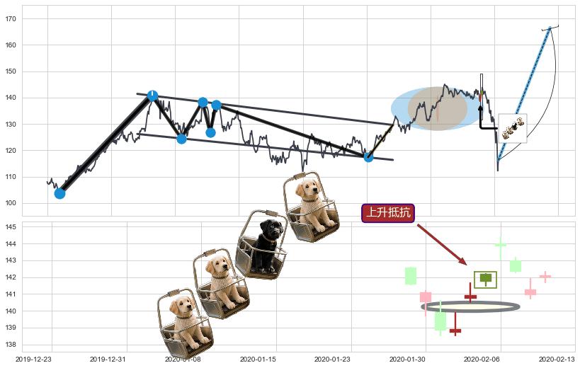 | 2 🅚:降势停顿 ➕ 📐:降旗形向上突破击穿阻力位, 猜想持续拉升上涨,被突破的阻力位已变为支撑位 ☞ 看多信号 ⇥ 【🅚线】交织【图形】⇥ 综合量化分数: 52 | > |