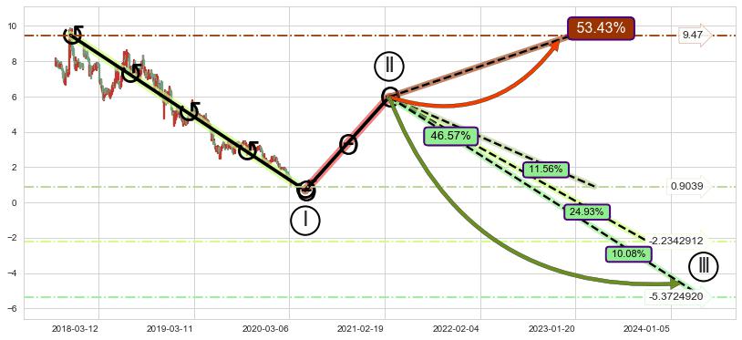 ➣ 循环浪继续向下【平均值】位置(2023-10-17, -2.2342912),匹配聚类样本比例53.54%, 可能性概率24.93%