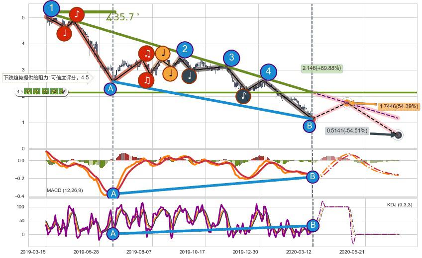 ♘ 在最后的下跌阶段2019-03-15至2020-03-13,存在 持续未破位的阻力位 ,阻力价格2.146,可信任强度88.80%,其距离最后价格1.1300相差 +89.88%
