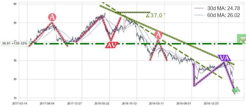 ➢ 【多方力量耗尽,空方打破攻守平衡点】下降三角形中继整理, 已在2019-05-13突破【支撑】颈线 30.70 →演变成下降通道