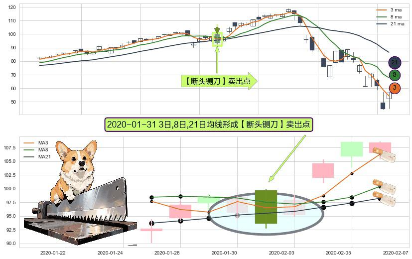 ⚀ 2020-01-31日显现 3日-8日-21日均线 【断头铡刀】卖出点 看空信号,后市看跌,卖出