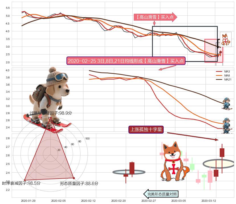| 2 🅚:【高山滑雪】买入点 ➕ 📐:降旗形向上突破击穿阻力位, 猜想持续拉升上涨,被突破的阻力位已变为支撑位 ☞ 看多信号 ⇥ 【均线】交织【图形】⇥ 综合量化分数: 52 | > |