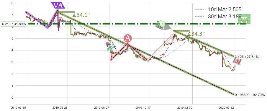 从2019-11-26至2020-03-13,共包含74个交易日,阶段股价下跌-64.65%,阶段股价变动位移路程比: 1 : 3,下跌趋势角度: 34.3