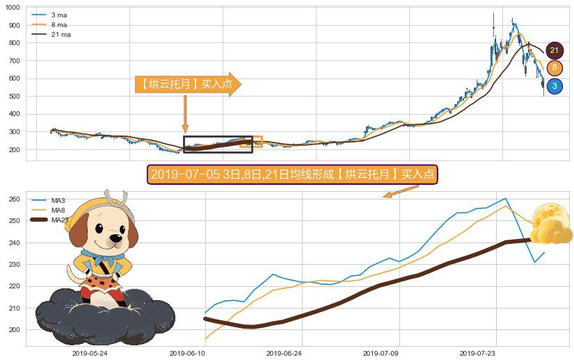 ⚀ 2019-06-10日-2019-07-30日显现 3日-8日-21日均线 【烘云托月】买入点 看多信号,后市看涨,买入