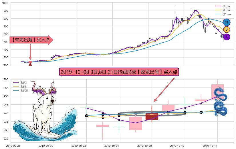 ⚀ 2019-10-08日显现 3日-8日-21日均线 【蛟龙出海】买入点 看多信号,后市看涨,买入