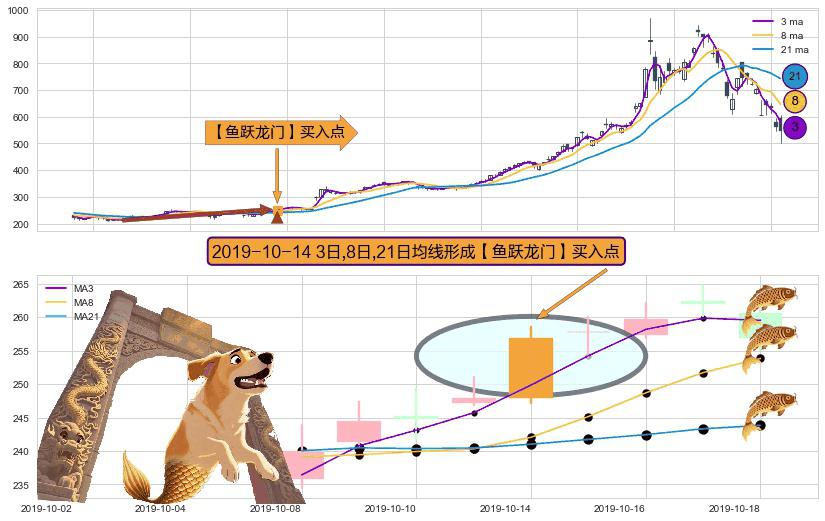 ⚀ 2019-10-14日显现 3日-8日-21日均线 【鱼跃龙门】买入点 看多信号,后市看涨,买入