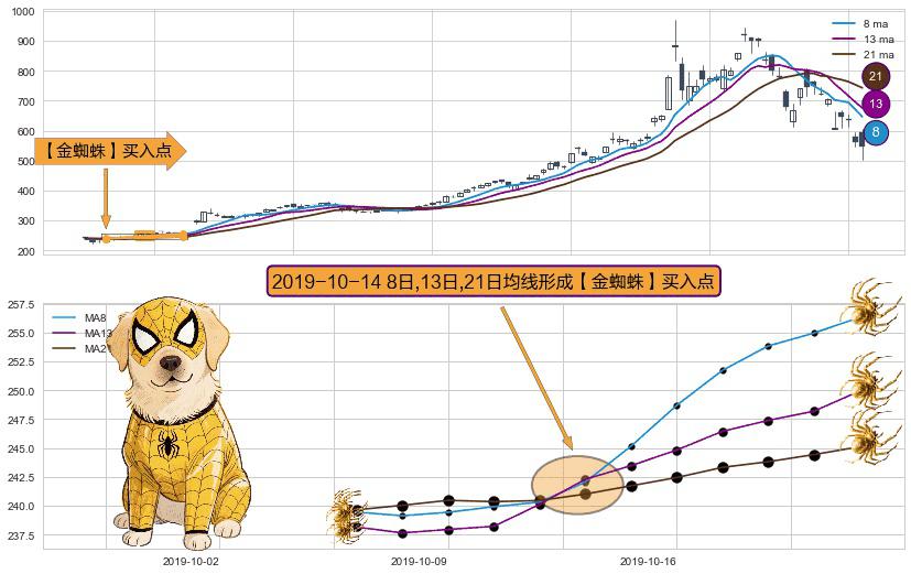 ⚀ 2019-10-14日显现 8日-13日-21日均线 【金蜘蛛】买入点 看多信号,后市看涨,买入