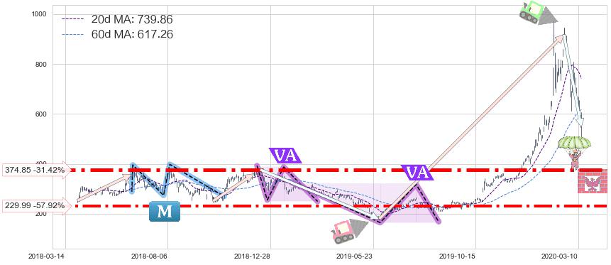 ♘ 支撑价格位374.85,可信任强度85.53%,距离最后交易2020-03-13形成的收盘价格546.62相差 -31.42%