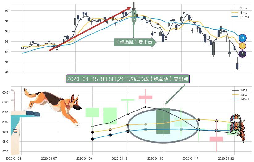 形态多维评估: ⚀ 2020-01-15日显现 3日-8日-21日均线 【绝命跳】卖出点 看空信号,后市看跌,卖出
