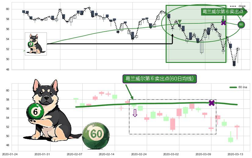 形态多维评估: ⚀ 2020-02-20-日显现 葛兰威尔均线 60日均线 第⑥卖出点 走势反转见顶信号,后市看跌,卖出信号