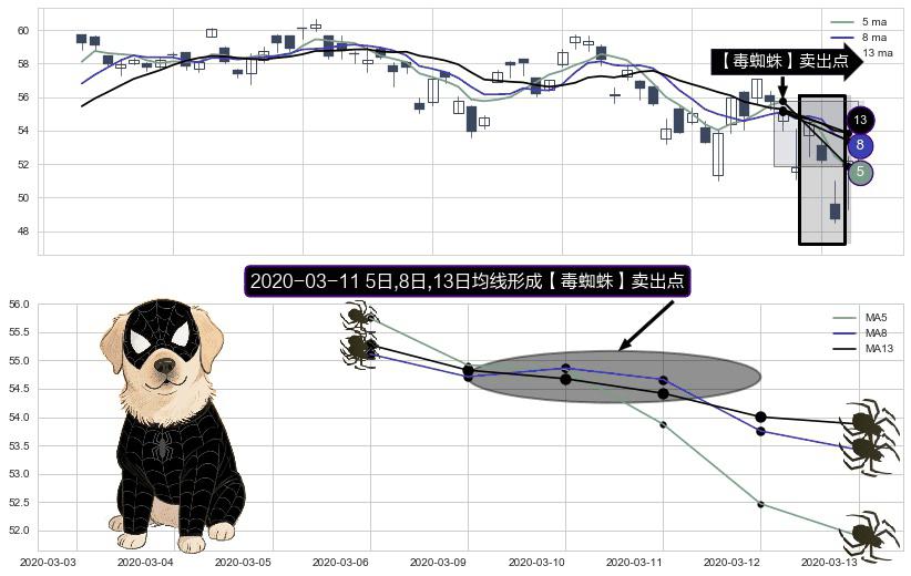 形态多维评估: ⚀ 2020-03-11日显现 5日-8日-13日均线 【毒蜘蛛】卖出点 看空信号,后市看跌,卖出