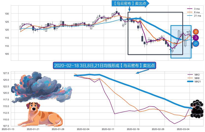 ⚀ 2020-01-30日-2020-03-05日显现 3日-8日-21日均线 【乌云密布】卖出点 看空信号,后市看跌,卖出