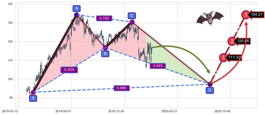 ➣ 未完成【蝙蝠】形态起点X: 2019-04-25, 已到达C点: 2020-01-21, 预测最终D点: 2020-08-14, 共324交易日