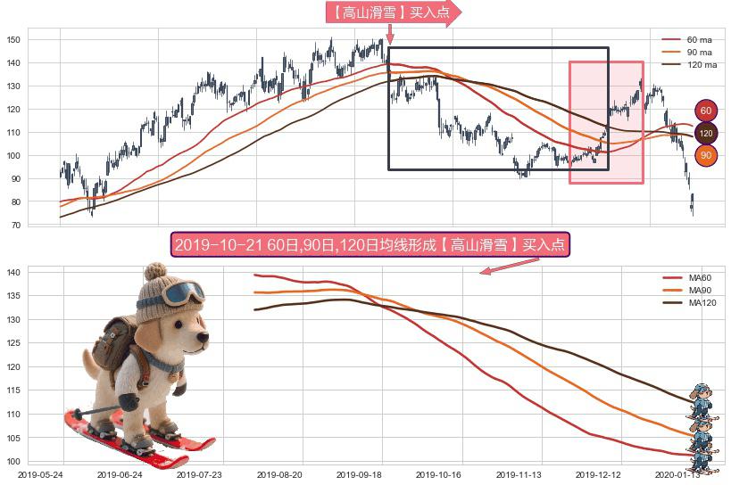 ⚀ 2019-08-02日-2020-01-09日显现 60日-90日-120日均线 【高山滑雪】买入点 看多信号,后市看涨,买入