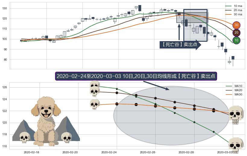 ⚂ 【死亡谷】卖出点 由MA10均线下穿MA20均线和MA30均线,MA20均线下穿MA30均线形成